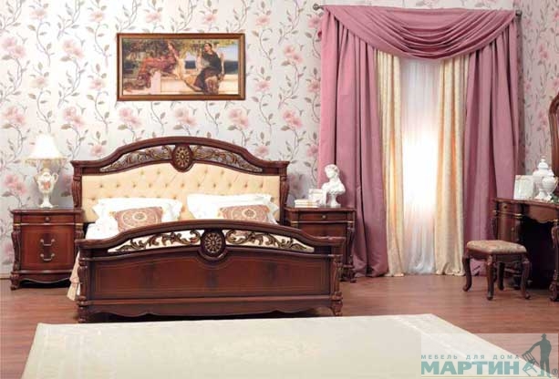 Золотые декоративные элементы и резной растительный орнамент, отделка из натуральной кожи в изголовьи кровати, добавляют яркую чувственность и роскошь благородной классической спальне.