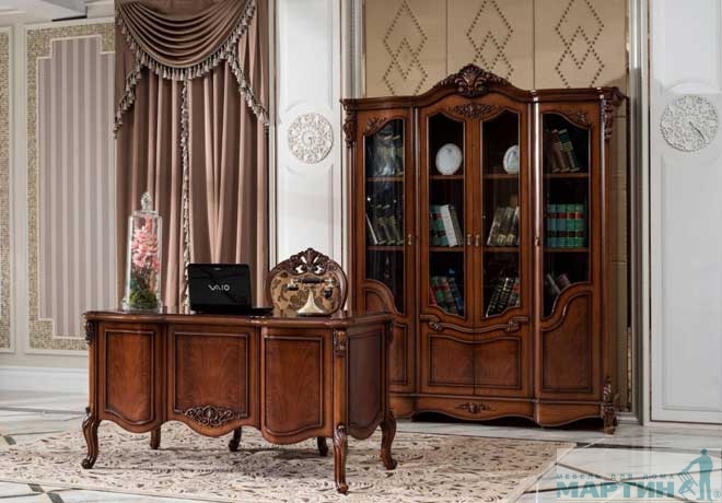 Мебель для кабинета Каролина: В комплекте Шкаф книжный 2270*508*1801 и Стол письменный 500*1498*750 Материал: ламинированный MDF Цвет: орех. Фасады оформлены декоративной резьбой.