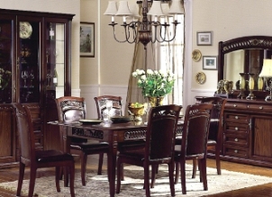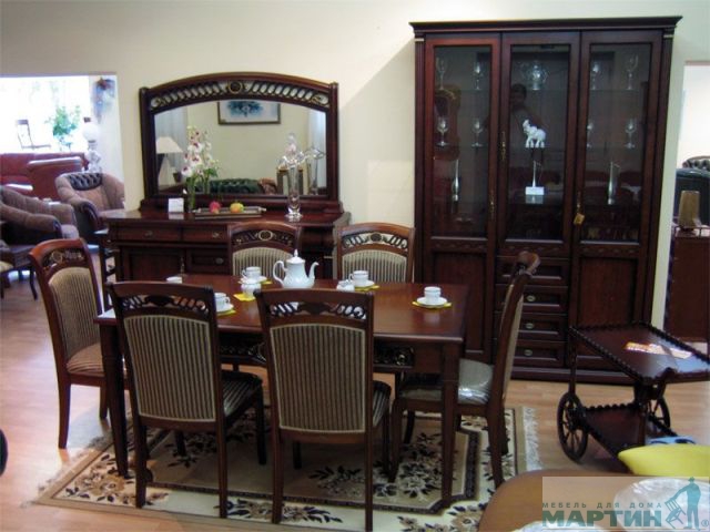 Размеры: стол - 160/200 см., витрина - 151*51*215 см., буфет с зеркалом - 161*51*96 см.