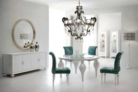 Гостиная «Palermo». Круглый стол с резными ноками округлой формы, отделка "белый лак". Стулья в том же стиле станут хорошим дополнением к столу, образуя полноценную обеденную группу. Цена: стол обеденный 61 350 руб., стул 25 705 руб.