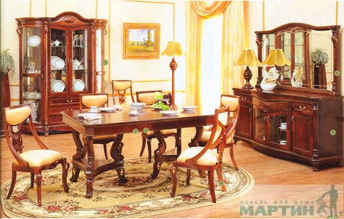 Модельный ряд: витрины 1дв., витрина 2 дв., витрина 4 дв., витрина угловая, зеркало к камоду, комод, стол обеденный, стул для обеденного стола, стол обеденный раздвижной.