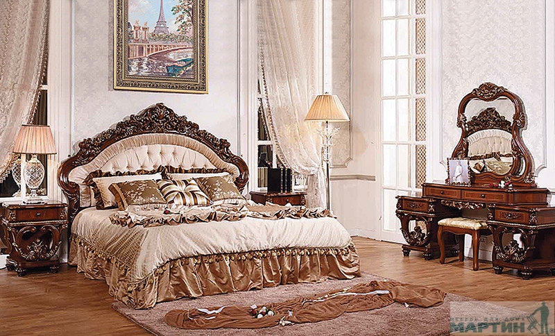 Спальный гарнитур Офелия выполнен в классическом стиле. Взгляд привлекают прикроватные тумбочки с необычными фасадами — может они и не очень вместительные, но точно способны украсить собой любую спальню. Мягкое изголовье кровати с кокетливыми «ушками» перекликается резьбой с рамой зеркала туалетного стола. Все смотриться изыскано и гармонично. Материалы: МДФ. Изготавливается в цвете: орех.