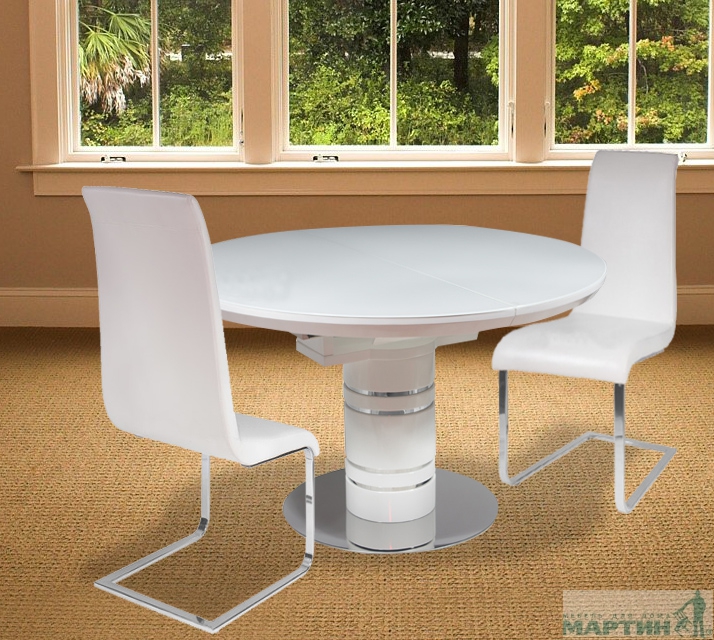 Материал: массив бука/металл/стекло экстрабелое Размер: D120(+40)x75 Раскладной: да Цвет: белый лак Форма: круглый Стул CK-3800 J (хром, белая экокожа)
